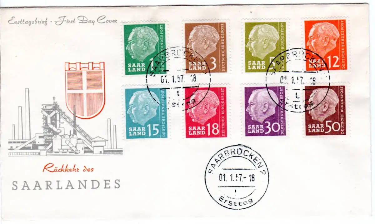 Saarland, 1-50 Pf., 8 versch. Heusswerte auf sauberem FDC v. Saarbrücken