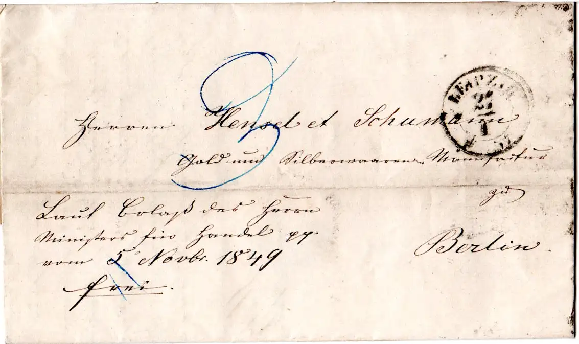 Faltbrief m. kpl. Inhalt u. vorders. Portofreiheitsvermerk Laut Erlaß des Herrn Minister für Handel v. 5. Novbr. 1849 frei. Die Portofeiheit wurde nicht anerkannt, der Brief nach Preussen m. 3 SGr. in Porto gesetzt. Ungewöhnlich!