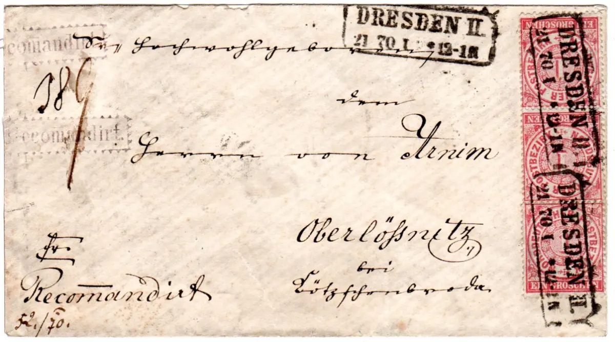 Sachsen 1870. 3x1 Gr. auf Einschreiben Brief m. nachverw. Sachsen-R2 Dresden II