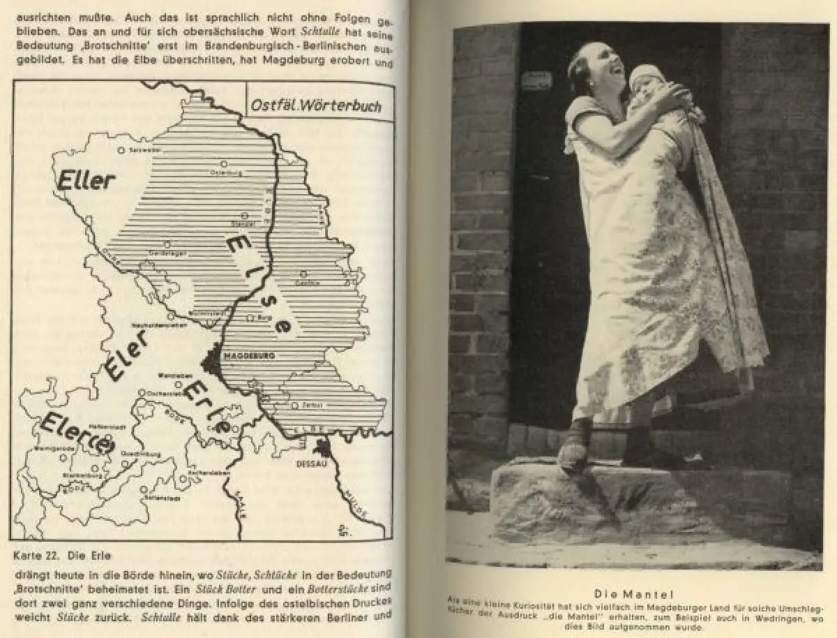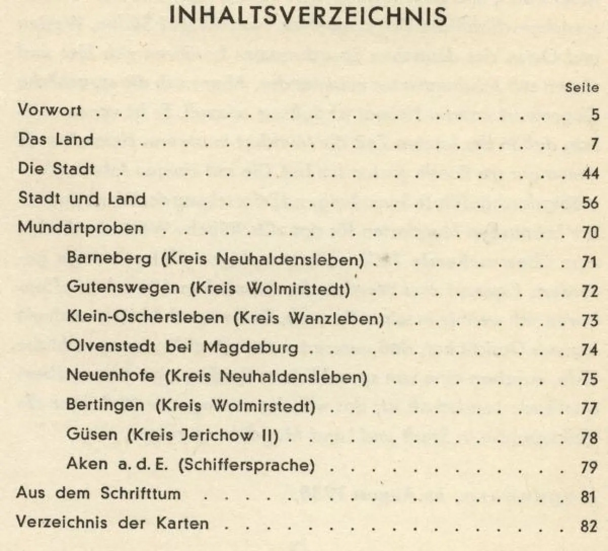 mit GESAMT 150 Seiten photographischen und druckgraphischen Abbildungen verschiedene Karten einem Quellen und Literaturverzeichnis Volkssprache und Mundart des Magdeburger Raumes das niederdeutsche Sprachgebiet Unterschiede zwischen Stadt und Land verschiedene Mundartproben Aussprache und Wortschatz der Kreise Neuhaldensleben Wanzleben Wolmirstedt Jerichow dem Magdeburger Umland und der Schiffersprache außerdem regionaltypische Begriffe und Eigennamen Vermischung von Dialektformen mit dem Hochdeutschen.