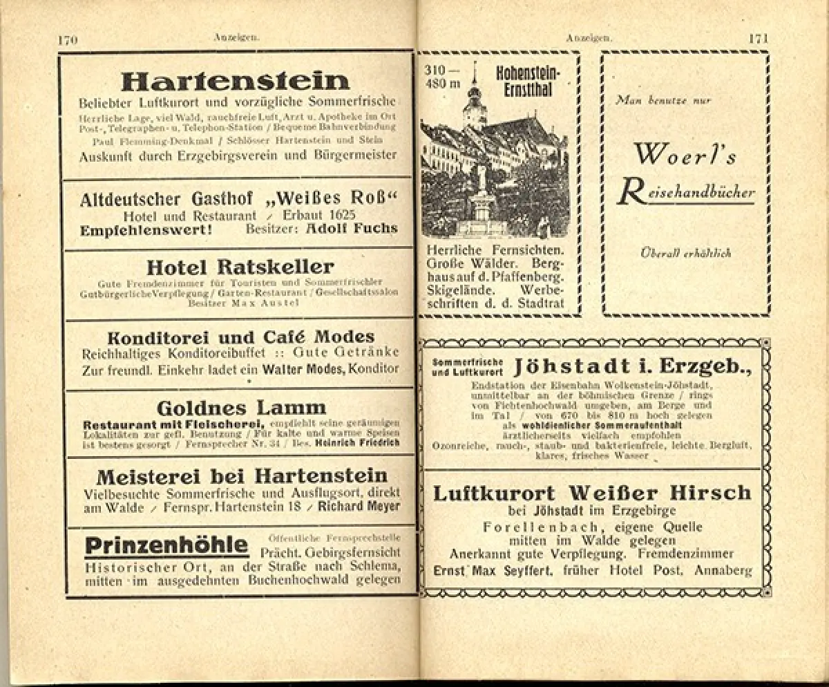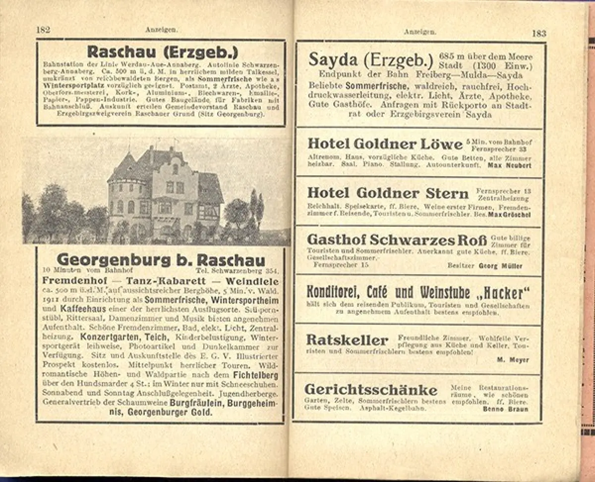 mit GESAMT 190 Seiten einer farbigen Übersichtskarte sowie Karten Stadtplänen und einem Ortsregister Geschichte des Erzgebirges seine Sprache sein Volks und Brauchtum Straßen und Verkehrswege Strecken der Eisenbahnen weiter Beschreibung von Wegen und Wanderungen für das gesamte Gebiet mit Kurzbeschreibung von ca 600 Städten Ortschaften Dörfern und Sehenswürdigkeiten der Region mit Angabe von Hotel und Übernachtungsmöglichkeiten weiter Anzeigen und Inserate regionale Hotel und Geschäftswerbung auf 30 Seiten