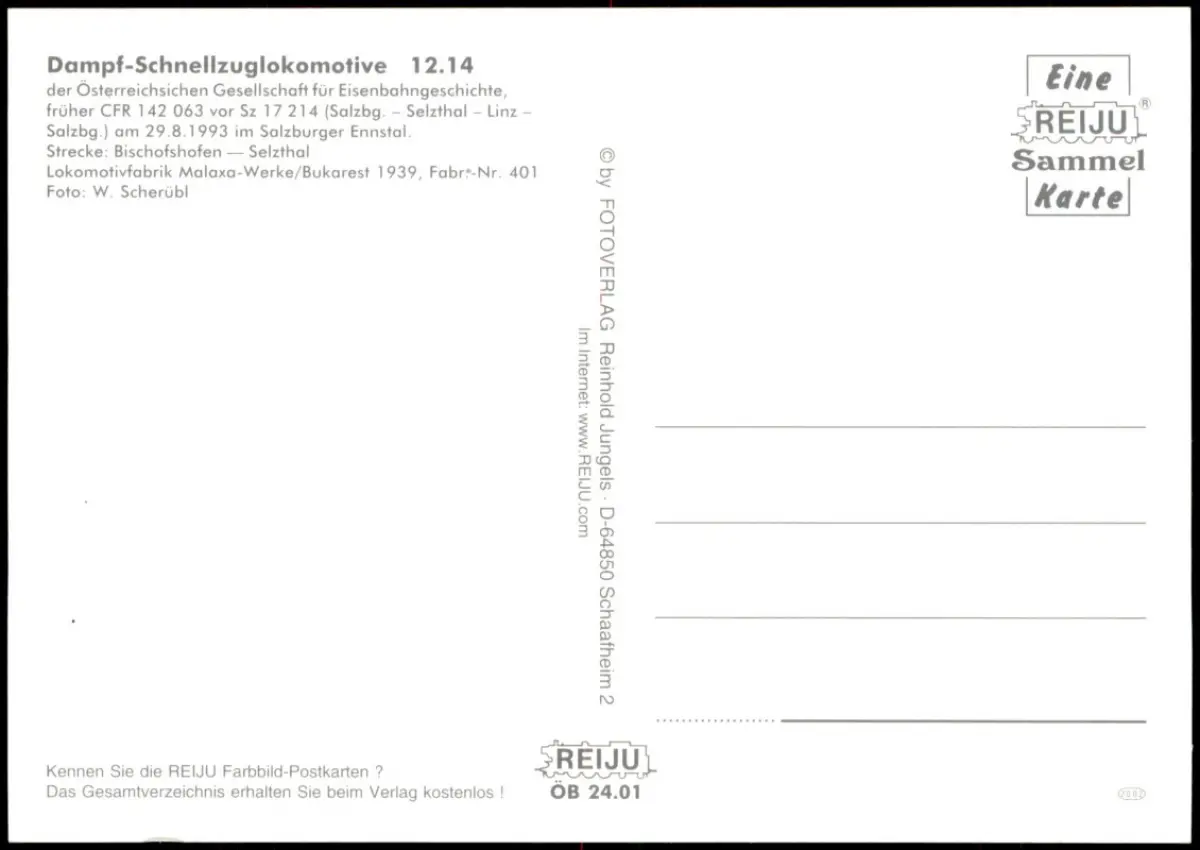 Infos: Dampf-Schnellzuglokomotive 12.14 der Österreichischen Gesellschaft für Eisenbahngeschichte, früher CFR 142 063, vor Sz 17 214 (Salzbg. - Selzthal - Linz-Salzbg.) am 29.8.1993 im Salzburger Ennstal. Die Strecke ist Bischofshofen-Selzthal. Die Lokomotive wurde 1939 von den Malaxa-Werken in Bukarest unter der Fabrik-Nr. 401 gebaut. Das Foto stammt von W. Scherübl. Die Postkarte wurde vom FOTOVERLAG Reinhold Jungels (REIJU) herausgegeben und trägt die Seriennummer ÖB 24.01.