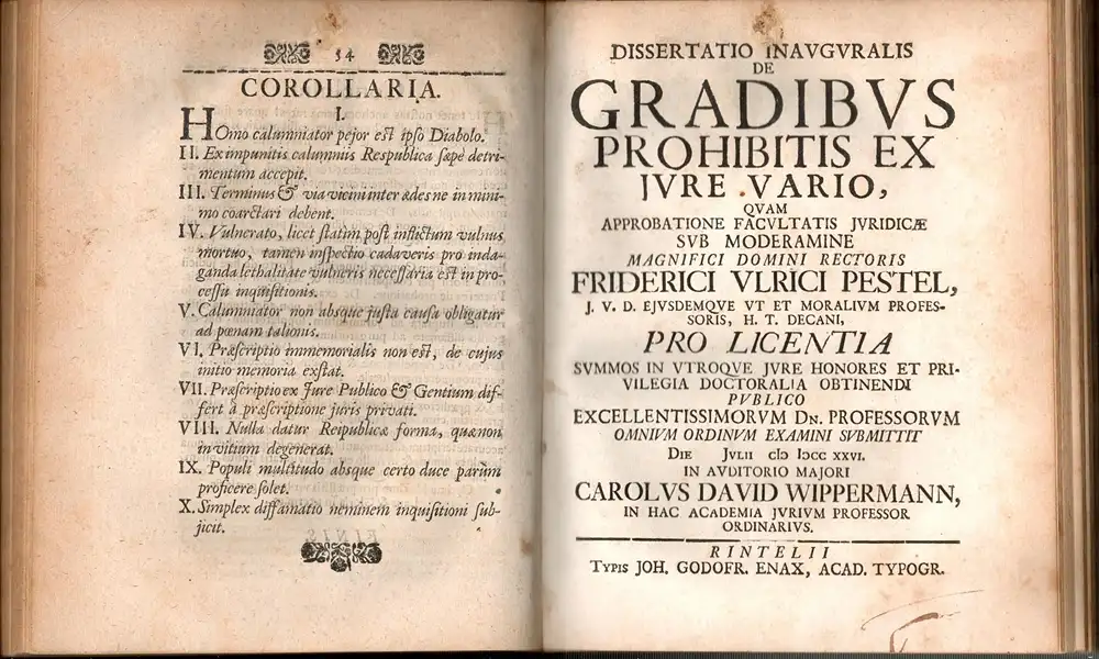 Nr. 7 = Wippermann/Pestel, De gradibus prohibitis: 3 x vorhanden. - Enthält (vom Respondenten ausgehend): [I.] STRUBE, David Georg: (Respondent) / NOODT, Gerhard (Praeside): De origine nobilitatis Germanicæ et præcipuis quibusdam ejus juribus. Dissertatio historico-politico-juridica. Leiden, Angelus Sylvius, 1717. [2] Bll., 108, [6] S. - [II.] KOTZEBUE, Georg Christian (Resp.) / ENGELBRECHT, Johann Wilhelm (Praes.): De lege commissoria contractui pignoratitio illicite et emtioni venditioni aliisque contractibus licite adiecta, Dissertatio iuridica. Helmstedt, Paul Dietrich Schnorr, 1729. [4] Bl., 40 S., [4] Bll. - [III.] OWEN, Heinrich Ernst: De vitandis quibusdam licitis ob viciniam illiciti. A. a. O., 1726. [4], [1-3] u. S. 4-48. - [IV.] PORTZEN, Friedrich Wilhelm von der: De usu practico distinctionis hominum in liberos et servos. Halle-Magdeburg, Salfeld, 1711. [1] Bl., 50 S. - [V.] KLENCK, Georg Ludwig von (Resp.) / PESTEL, Friedrich Ulrich [1691-1764] (Praes.): Larvam detrahens jctorum opinionibus invidiae plenis. Exercitatio academica, ... Rinteln, Johann Gottfried Enax, 1723. [2] Bll., 52 S. - [VI.] KROEBERGK, Johann Andreas von (Resp.) / GODEN, Eduard Franz (Praes.): Disputatio juridica inauguralis repraesentans casus forenses notabiles et practicos eorumque resolutiones, ... A. a. O., 1712. [1] Bl., 54 S. - [VII.] WIPPERMANN, Karl David (Resp.) / PESTEL, F. U. (Praes.): De gradibus prohibitis ex jure vario. Dissertatio inauguralis, ... A. a. O., 1726. [1] Bl., 48 S. - In triplo (siehe Nr. XXIII u. XXV). - [VIII.] ROST, Friedrich Melchior (Resp.) / BRUCKNER, Wilhelm Hieronymus (Praes.): De levamine oneris sportularum oder: Von Erspahrung der Gerichts-Kosten. Disputatio inauguralis juridica, ... Jena, Werther, 1718. [1] Bl., 12 S. - [IX.] HELPER, Johannes (Resp.) / KESTNER, Heinrich Ernst (Praes.): Coclusiones zollianas, ...publico eruditorum examini submittunt, ... Rinteln, J. G. Enax, 1718. - [X.] KRÜGER, Johann Friedrich (Resp.) / KRESSIUS, Johannes Paul (Praes.): Jvris civilis et statutarii Luneburgici differentiæ insigniores, ... Helmstedt, Hermann Daniel Hamm, 1716. [1] Bl., (2) 101 S. - [XI.] HAUS, Friedrich Ludwig von (Resp.) / BIERLING, Friedrich Wilhelm (Praes.) /: De eruditione politica, oder Wie man cavalierement studieren solle? Dissertation. Rinteln, Hermann August Enax, 1708. [1] Bl., 48 S. (auf S. 1 fälschlich S. 2 eingedruckt). - [XII.] OWEN, Heinrich Ernst (Resp.) / SCHRAMM, Jonas Conrad (Praes.): Disputationem inauguralem ceterosque Actus Solennes, ... Helmstedt, P. D. Schnorr, 1726. [1] Bl., 6 ungezählte S. - [XIII.] STARCK, Johann Martin (Resp.) / HEISTER, Laurentius (Praeside): De medicinae utilitate in iurisprudentia. Dissertation. A. a. O., 1730. [1] Bl., (4) 60 (6) S. - [XIV.] SENCKENBERG, Heinrich Christian (von): De feudis Brunsvicensibus et Luneburgicis. Disquisitio. Mit Anhängen. Göttingen, Schultze, 1738. [4] Bll., LXII , 32 S. - Ohne die Bogenlage A (die 1 Kupfertaf. enthielt?). -[XV.] HUDE, Sigmund Johannes von der (Resp.) / AYRER, Georg Heinrich (Praesi.): De legitima parentum pactis dotalibus exclusa. Dissertation. Göttingen, Vandenhoeck, 1748. [3] Bll., 24 S., [1] Bl. -[XVI.] LINDERN, Johann Philipp von (Resp.) / PESTEL, F. U. (Praes.): De commodis incertitudinis, - Rinteln, J. G. Enax, 1720. [1] Bl., 88 S. - [XVII.] ROTTMANN, Friedrich Julius (Resp.) / LUDEKING, Conrad (Praes.): De injustitia, quae sub praetextu favoris causarum committitur, - Dissertatio juridica solemnis. A. a. O., 1721. [1] Bl., 54. S. - [XVIII.] MARQUARD; Florinus Friedrich (Resp.) / PESTEL, F. U. (Praes.): De lege Anastasiana, - A. a. O., 1732. [1] Bl., 22 S. - [XIX.] BRINCK, Sigismund Mauritius von (Resp.) / PESTEL, F. U. (Praes.): De cauta adplicatione axiomatis: Surrogatum sapit naturam eius, cui est surrogatum, - Ecercitatio iuris publici. A. a. O., 1733. [1] Bl., 46 S. - [XX.] BOURGK, Johann Martin (Resp.) / KESTNER, H. E. (Praes.): De usuris pari gaudentibus privilegio cum sorte in concursu creditorum, - Dissertation. A. a. O, 1722. [1] Bl., 26 S. - [XXI.] BECKER, Philipp (Resp.) / PESTEL, F. U. (Praes.): De comitiis provincialibus, vulgo Land-Tagen. Dissertation. A. a. O., 1732. [1] Bl., 54 S. - [XXII.] Ders. (Resp.) / PESTEL, F. U. (Praes.): De edicto divi Hadriani tollendo, - Exercitatio academica. A. a. O., 1723. [3] Bll., 50 S. - [XXIII.] WIPPERMANN, Karl David (Resp.) / PESTEL, F. U. (Praes.): De gradibus prohibitis ex jure vario. Dissertatio inauguralis, ... A. a. O., 1726. [1] Bl., 48 S. - Doublette der Nr. VII. - [XXIV.] MORGENSTERN, Bodo Heinrich (Resp.) / PESTEL, F. U. (Praes.): Utrum unus testis faciat torturæ locum? (Schafft ein einzelner Zeuge einen Platz für Folter?), - A. a. O., 1726. [1] Bl., 32 S. - [XXV.] WIPPERMANN, Karl David (Resp.) / PESTEL, F. U. (Praes.): De gradibus prohibitis ex jure vario. Dissertatio inauguralis, ... A. a. O., 1726. [1] Bl., 48 S. - Triplette der Nr. VII. - [XXVI.] ROGGE, Heinrich (Resp.) / PESTEL, F. U. (Praes.): De justa exheredatione liberorum jure Hamburgensi, vulga Die Enterbung der Kinder nach dem Hamburgischen Recht, - A. a. O., 1728. [3] Bll., 46 S. - [XXVII.] PESTEL, Friedrich Ulrich: Programma quo ... ad Dissertationem inauguralem De exheredatione liberorum jure Hamburgensi, quam ... candidatus Dn. Henricus ROGGE, Rostochiensis. die 30. Aug. A. 1728. ... publicae disquisitioni subjiciet ... officiose ac peramanter invitat. A. a. O., 29. Aug. 1728. [6] Bll. - [Einladung d. Dekans der Jurist. Fakultät zur Verteid. d. Dissertation Rogges; enth. Lebenslauf des Kandidaten.] [XXVIII.] ROTTMANN; Johann Ludwig (Resp.) / BIERLING, Konrad Friedrich Ernst (Praes.): De ratione, Dissertation. A. a. O., 1712. 28 S. - [XXIX.] GRÖN, Matthias [Grøn, aus Christiania] (Resp.) / FÜRSTENAU, Johann Hermann [1688-1756] (Praes.): De aëre. Exercitatio oeconomica. A. a. O., 1732. 16 S. - [Legte insgesamt 3 Diss. in Rinteln vor: Novum circa aëroscopiam tentamen, 1731; De aëre. 1732; De odoribus. 1732.]. - - Hs. Rückent