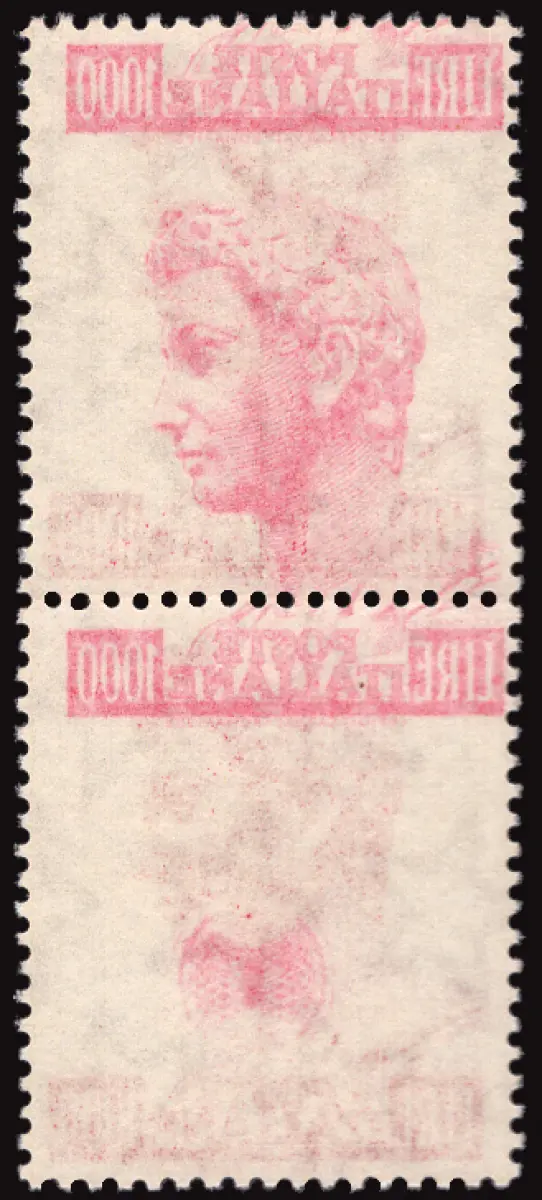 MNH - Vollgummi - San Giorgio Lire 1.000 Nr. 811/ie Vertikaldrehmoment mit scharfem Vollabziehbild stark nach oben verschoben - Ungewöhnlich - Kat. euro 180+ Cod. 791/17