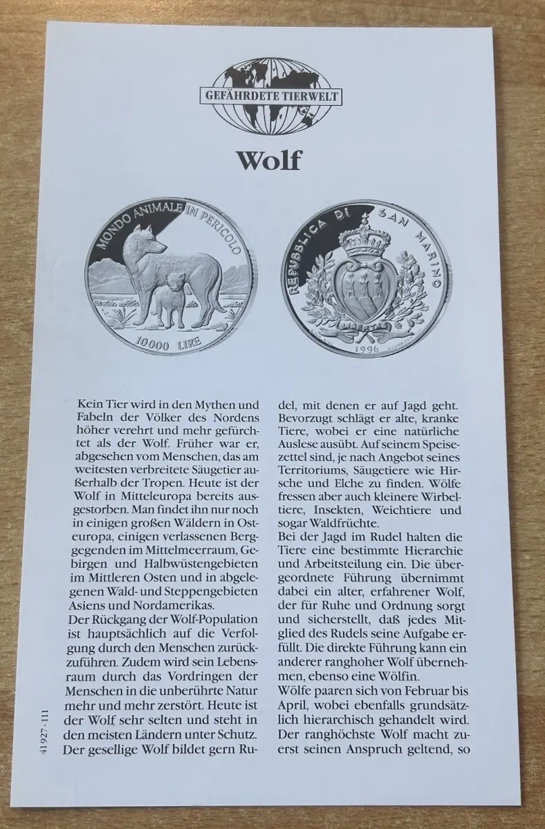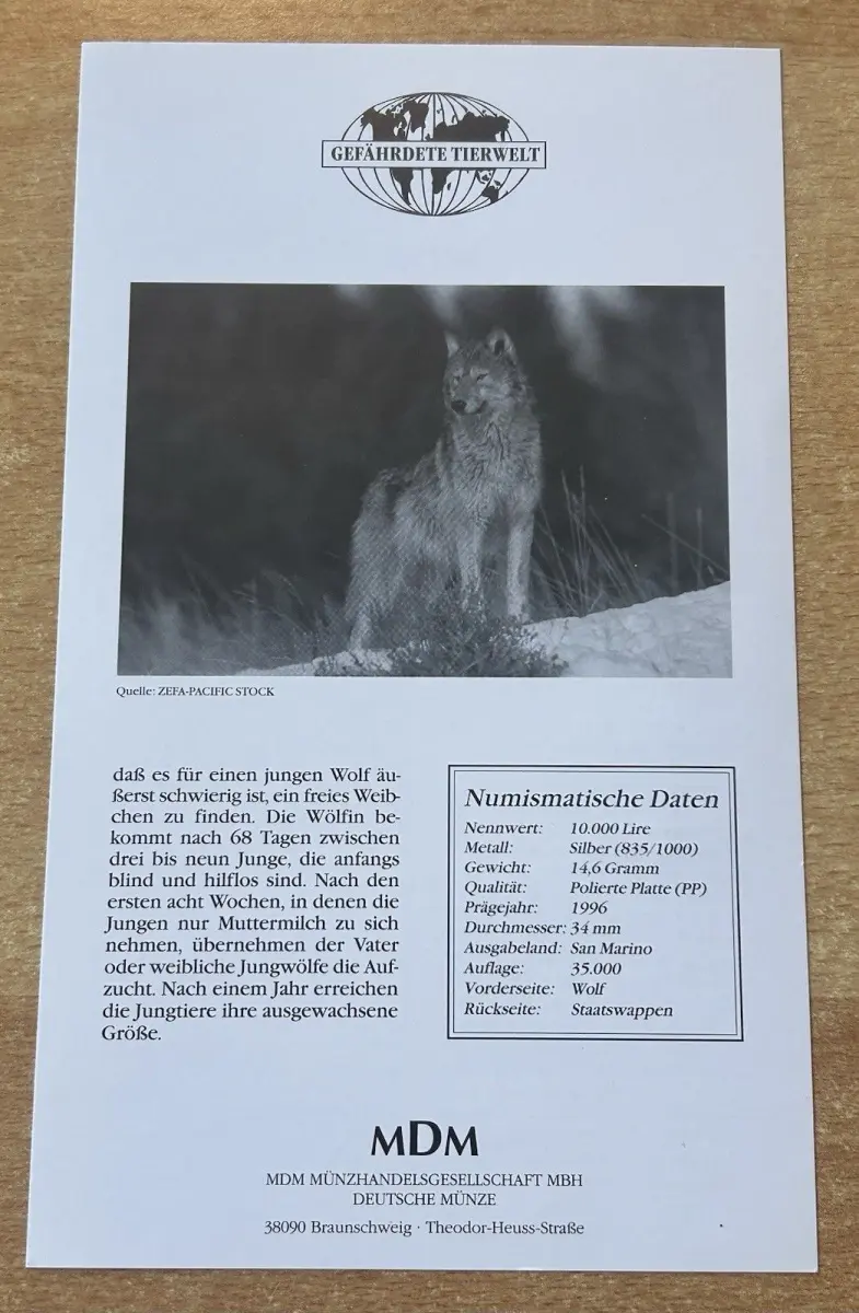 San Marino 10000 Lire 1996 Wolf Tierwelt Silber, PP