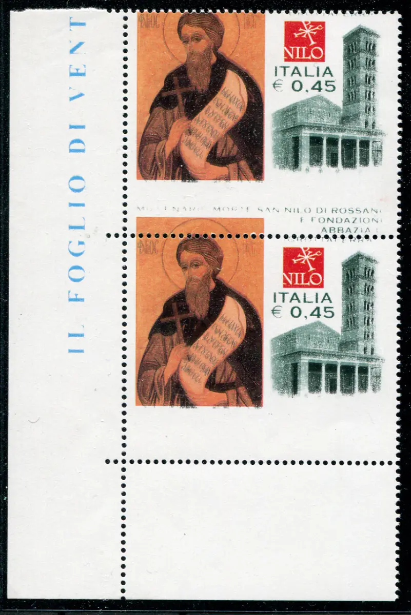 San Nilo di Rossano Sorte verschobene Verzahnung 2 Vollgummi - MHN - - San Nilo di Rossano Nr. 2778 vertikales Paar a. von f. unten mit stark verschobenen horizontalen Verzahnung und unvollständigem verblassendem Gründruck - unteres Exemplar ohne Schriftzug oben (letzte Reihe des Blattes) - Ungewöhnlich Cod. 880/14