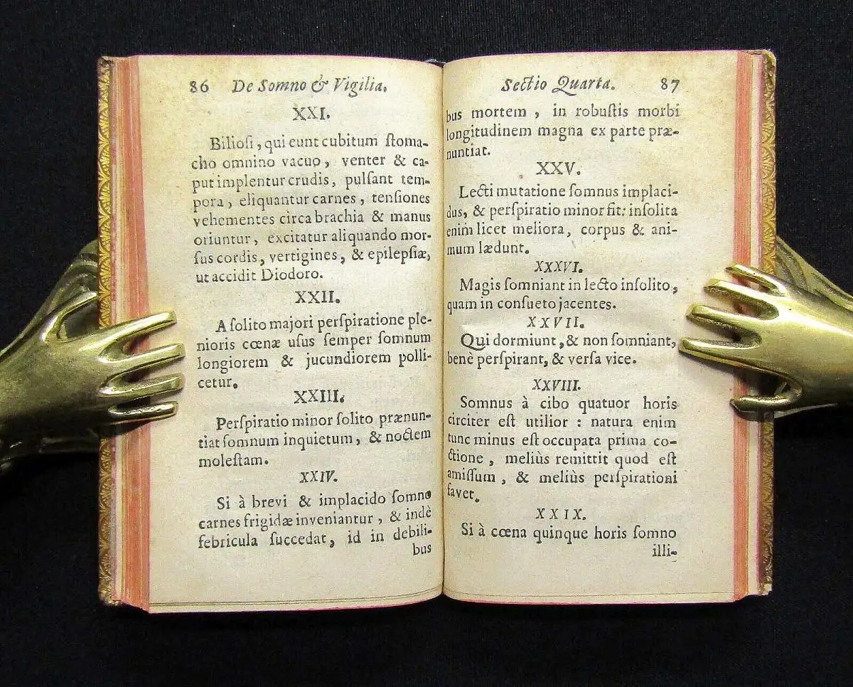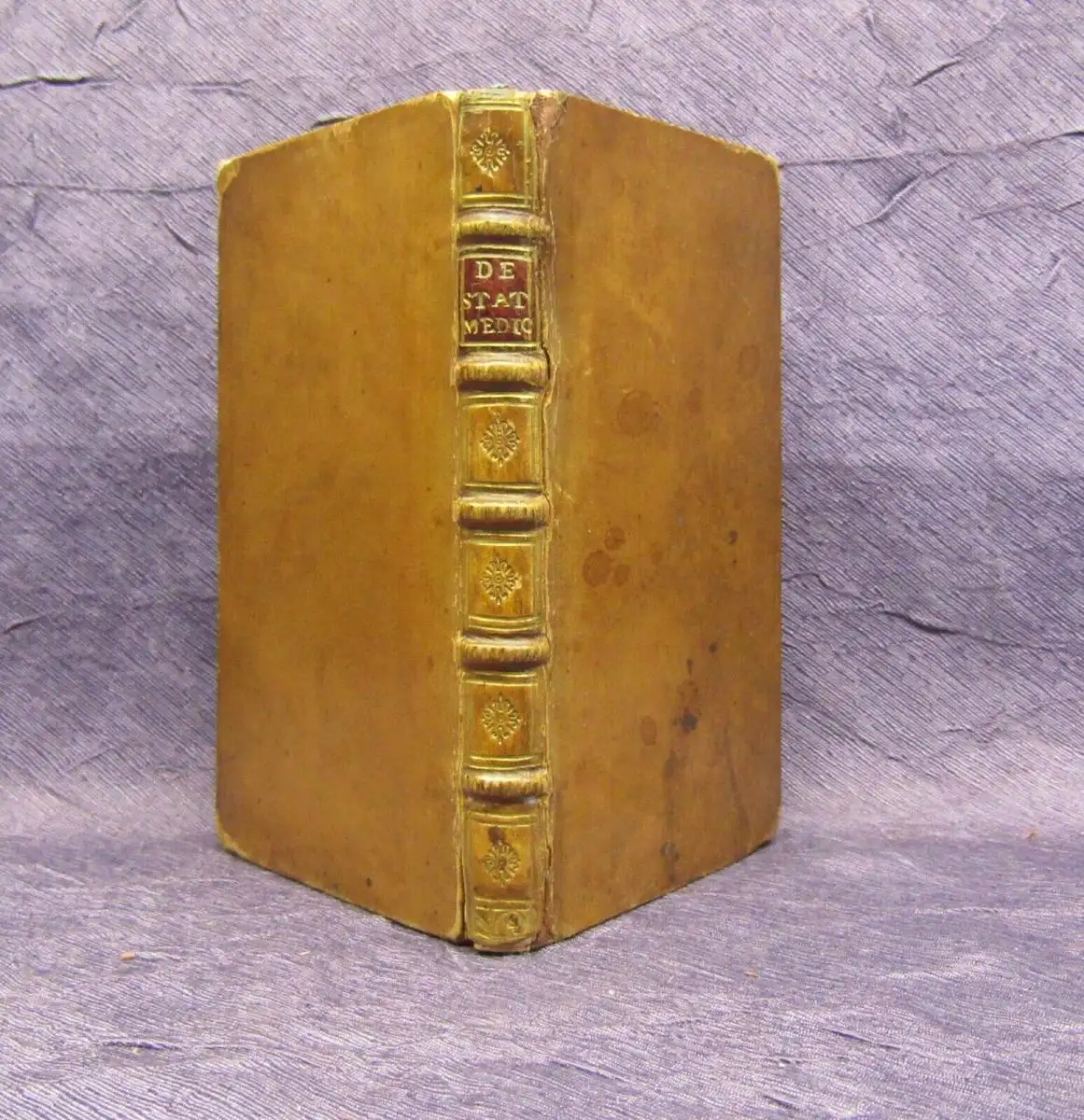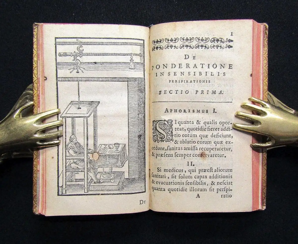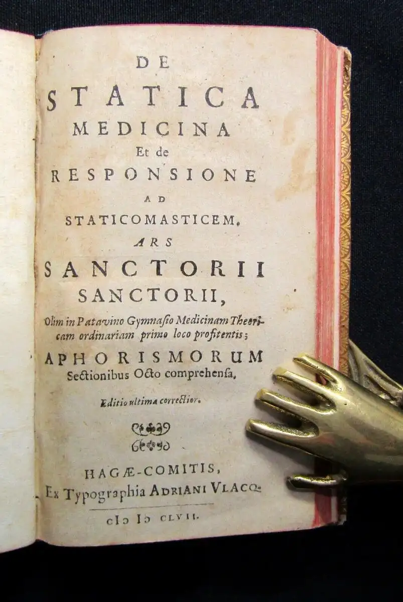 Santorio Santorio (latinisiert Sanctorius; 29. März 1561 Capo d’Istria, Istrien; † 22. Februar 1636 in Venedig) war ein italienischer Mediziner, der physiologische Untersuchungen anstellte und als Erster systematische Stoffwechselforschungen durchführte. Er war zudem einer der ersten Ärzte, die nachgewiesenermaßen Selbstversuche anstellten, und war Mitbegründer der Iatrophysik. Er war Erfinder der Stoffwechselwaage (siehe Holzschnitt) (vgl. Wikipedia). - Noch frühe Ausgabe (EA 1612) der wichtigen Schrift. Die erste englische Übersetzung erfolgte erst 1737
