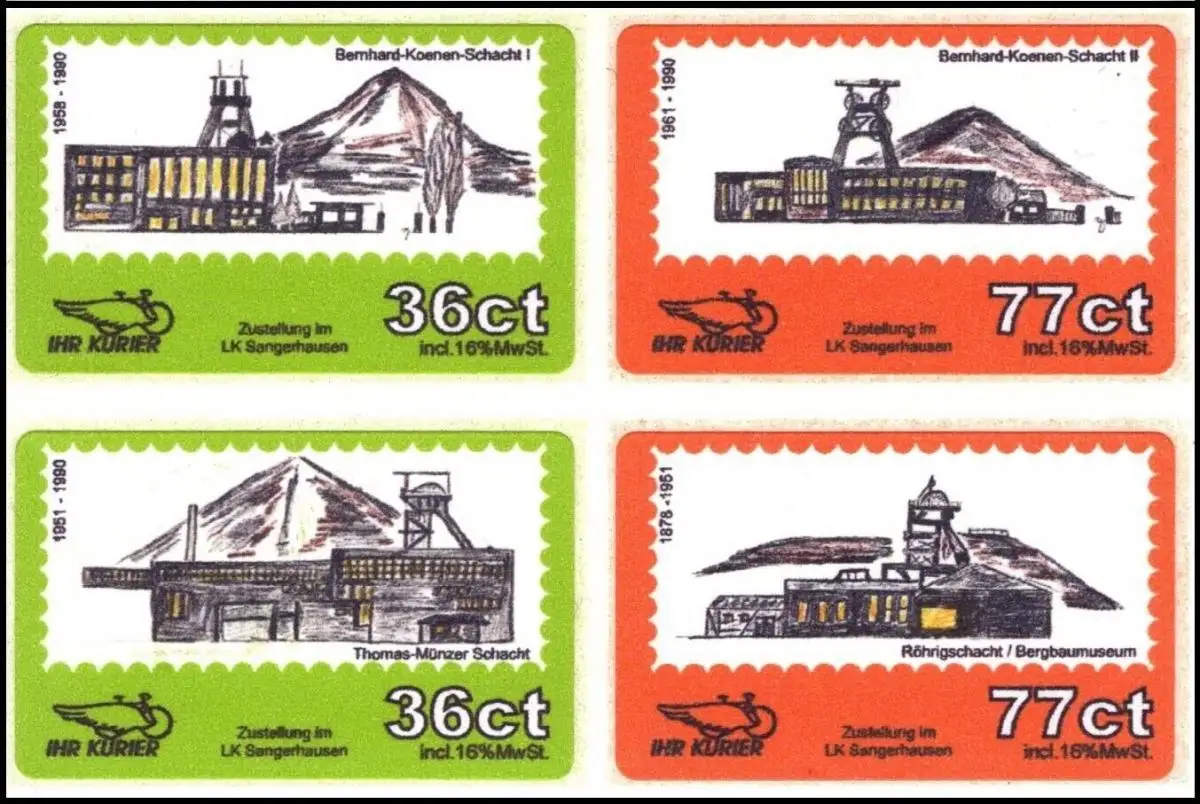 • MichSeite Sangerhäuser Kurier: MiNr. 5 II - 8 II, 11.07.2005, "Schachtanlagen im Landkreis Sangerhausen", Satz, postfrisch Beschreibung \nAusgabeland: Bundesrepublik Deutschland \nPostdienstleister: Sangerhäuser Kurier, Sangerhausen \nAusgabeanlass: Briefmarkenausgabe "Schachtanlagen im Landkreis Sangerhausen" Katalognummer: MiNr. 5 II - 8 II Ausgabedatum: 11.07.2005 Nominale: Satz (4 Werte, zusammen gedruckt) zu 0,36 EUR (2 x), 0,77 EUR (2 x) \nTyp: - \nErhaltung: selbstklebend, gerade gestanzt, postfrisch \nHinweis: geringe Auflage von 125 Stück Thema: Bergbau, Förderanlagen, Kupfer, Erz