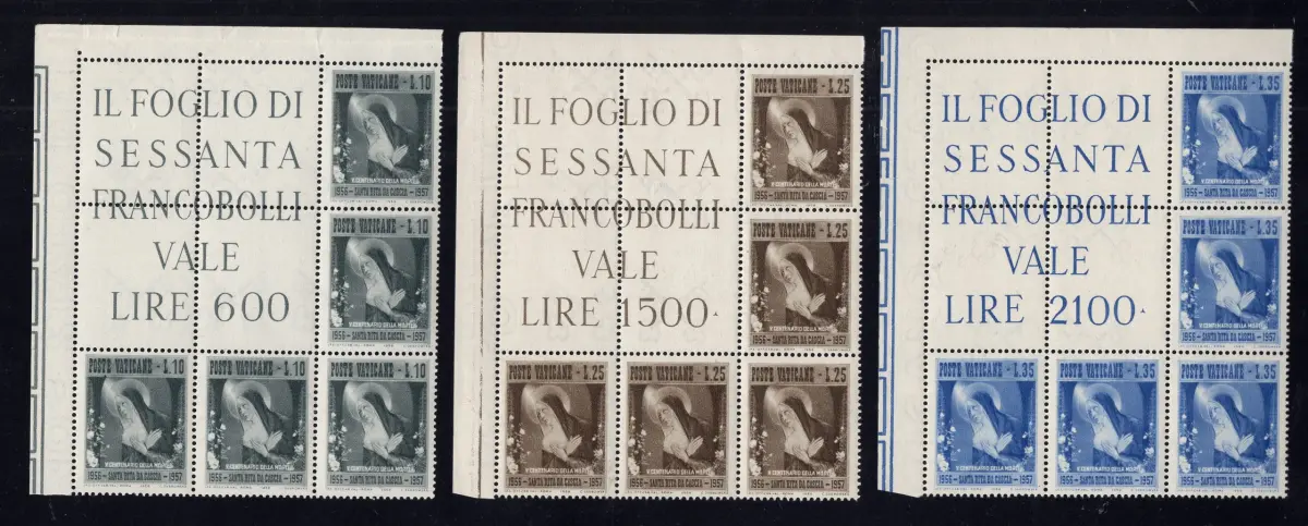 MNH ** - Santa Rita da Cascia die Serie von drei Werten im Eckblock von fünf Exemplaren (Katalog Coll.it Nr. 6/8) - Neuer perfekter Vollgummi Cod. 2174/WEB