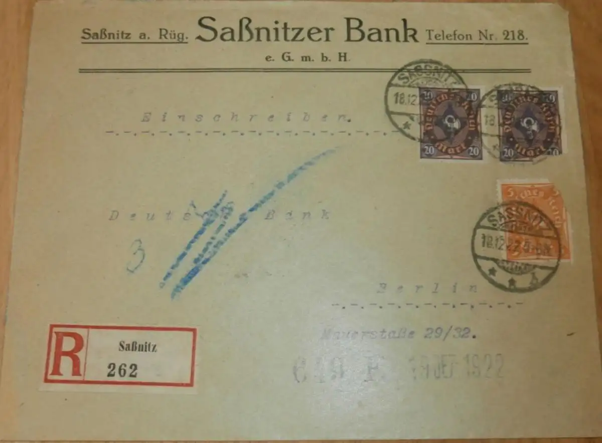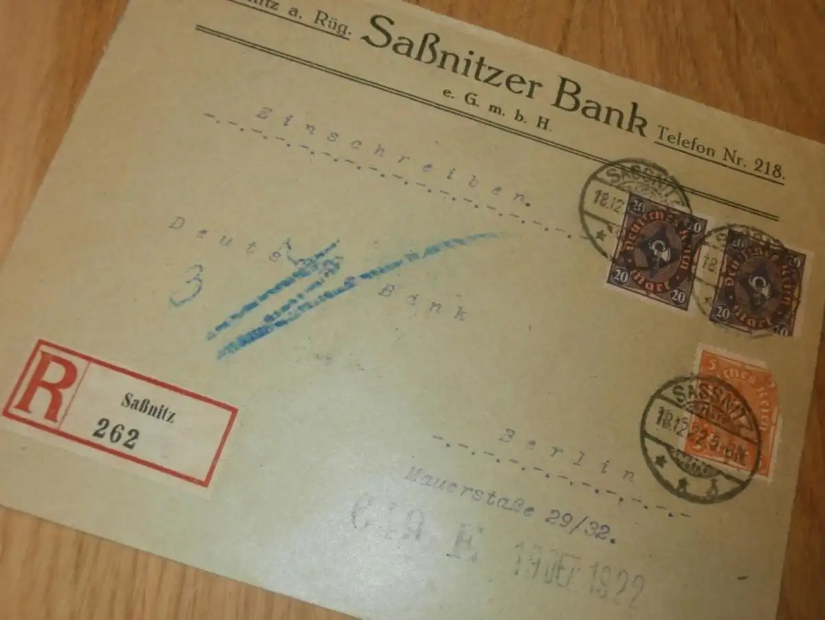 Saßnitzer Bank in Saßnitz a. Rügen , 1922 , Einschreiben , alter Briefumschlag , Reklame , Mecklenburg !