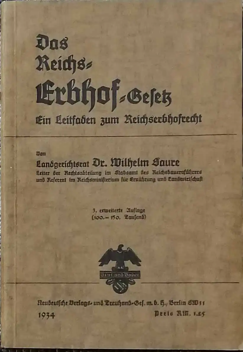 Deckeltitel " Das Reichs-Erbhof-Gesetz" Mit Gesetzesregister und Sachwortverzeichnis.