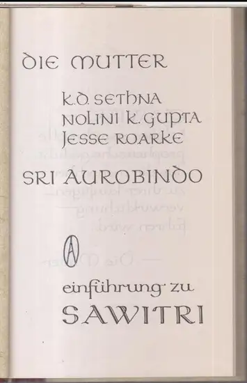Titel: Einführung zu Sawitri. - Im Inhalt: Die Mutter / K. D. Sethna / Nolini K. Gupta / Jesse Roarke / Sri Aurobindo / Anhang: Das Wort als Mantra. Geist und Spirt. Zur Übersetzung. Übertragung der Zitate