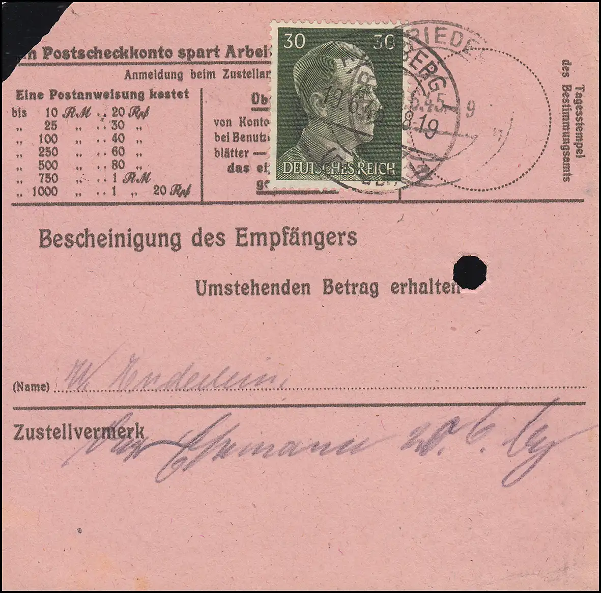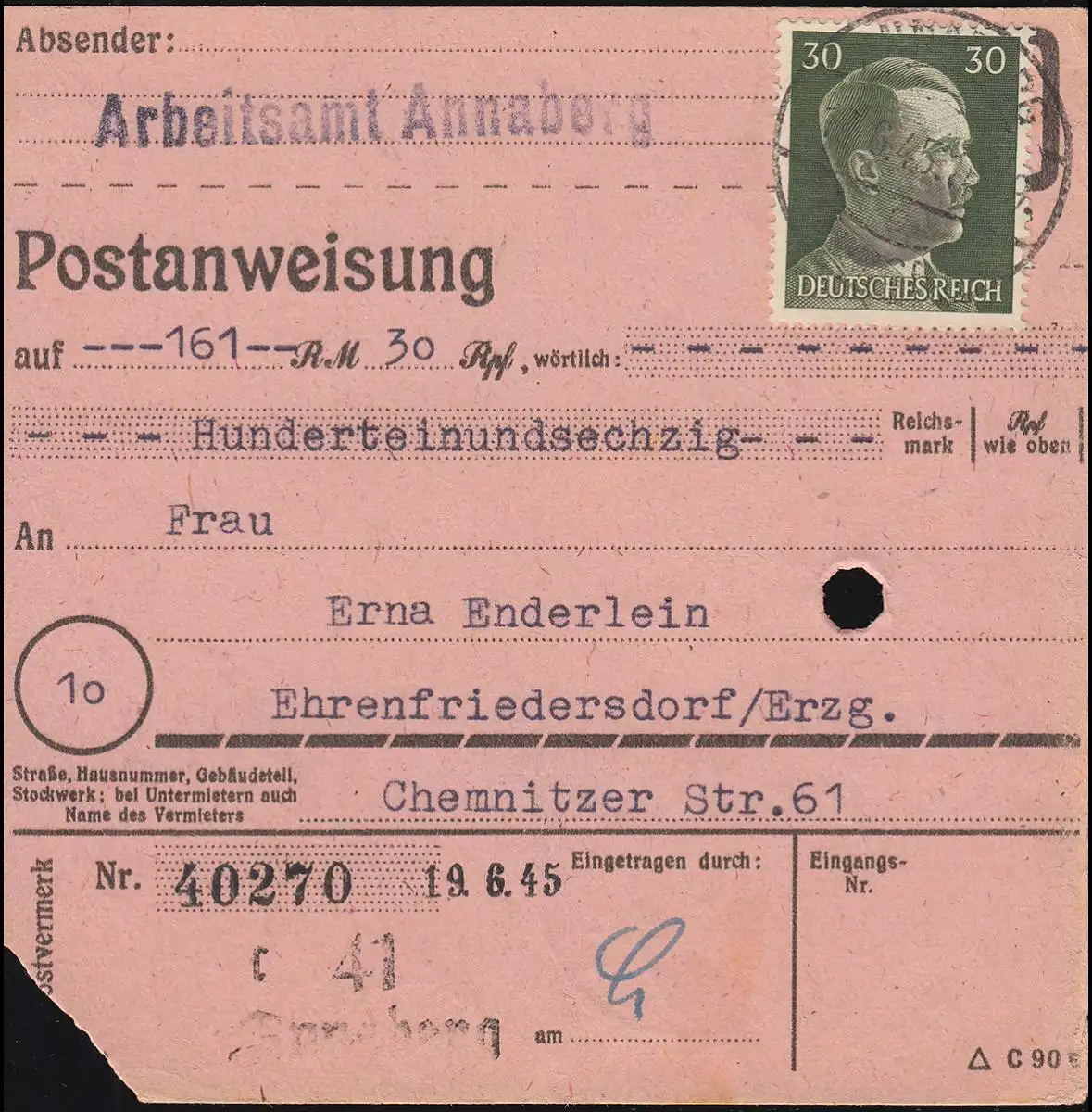 Saxe noircissement AP 794I Hitler 30 Pf sur instruction postale ANNABERG 19.6.45