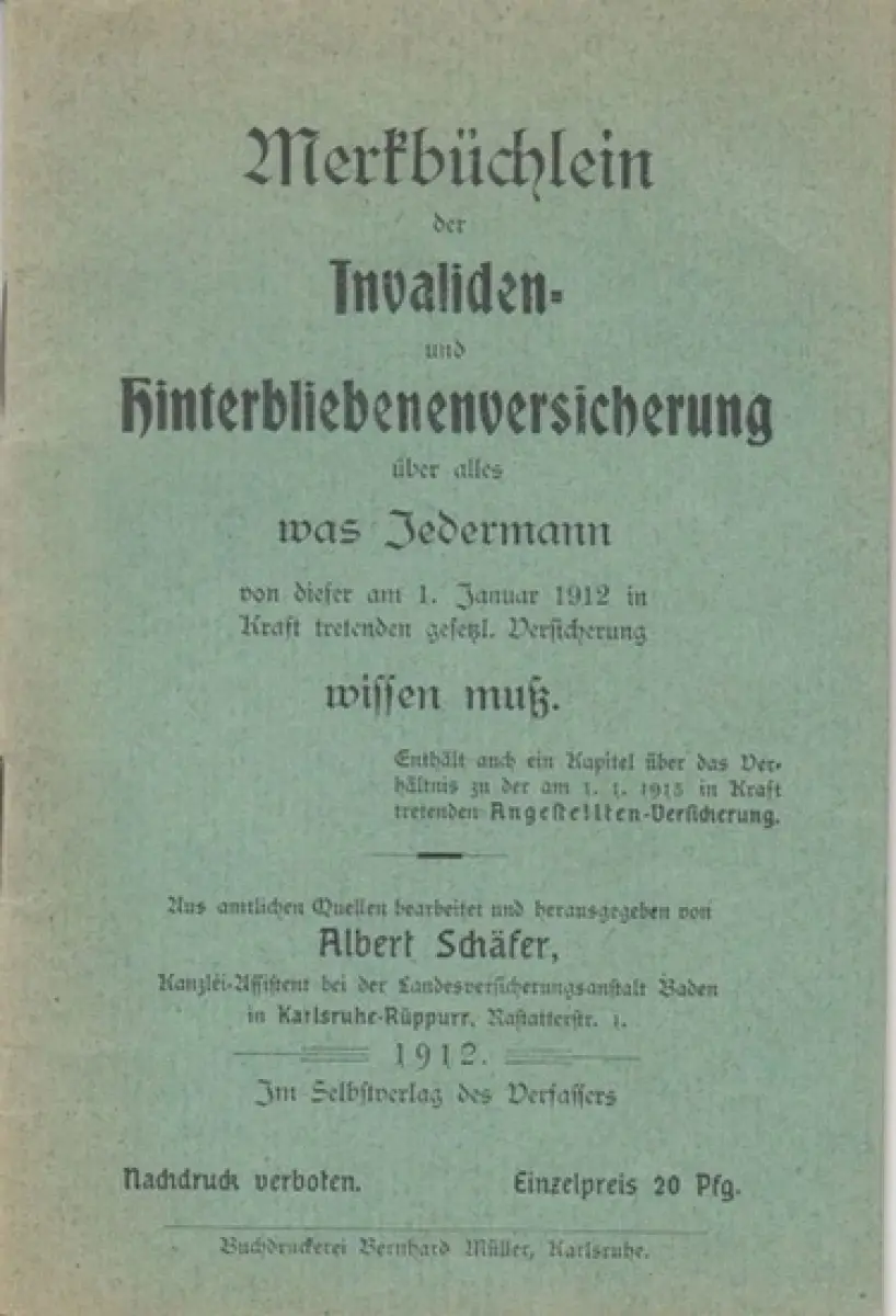 Schäfer, Albert: Merkbüchlein der Invaliden- und Hinterbliebenenversicherung - über alles was Jedermann von dieser am 1. Januar 1912 in Kraft tretenden gesetzl. Versicherung wissen muß. Enthält auch ein Kapitel über das Verhältnis zu der am 1. 1. 1913 in