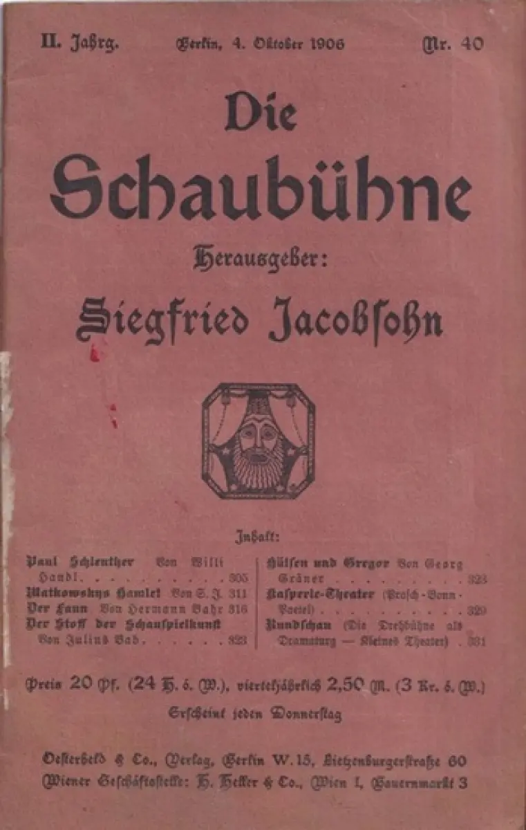 Schaubühne, Die - Siegfried Jacobsohn (Hrsg.): Die Schaubühne. II. Jg. 1906. Nr. 40 vom 4. Oktober 1906. Aus dem Inhalt: Julius Bab: Der Stoff der Schauspielkunst / Hermann Bahr: Der Faun / Paul Schleuther: Von Willi Handl / Matkowskys Hamlet u.a.