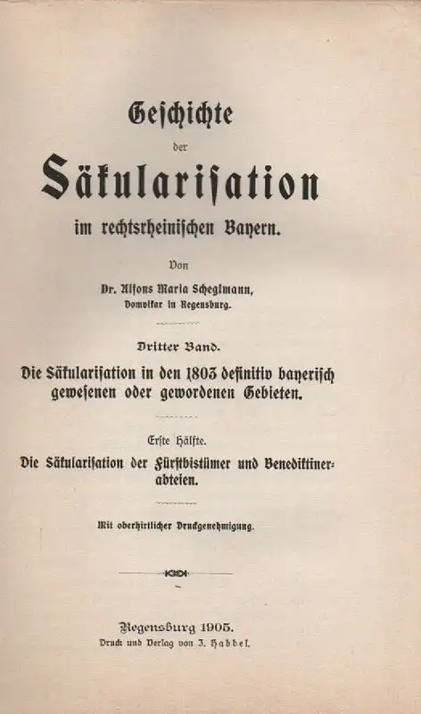 Scheglmann, Alfons Maria: Geschichte der Säkularisation im rechtsrheinischen Bayern. 3,1. Bd. 3, Die Säkularisation in den 1803 definitiv bayerisch gewesenen oder gewordenen Gebieten ; T. 1, Die Säkularisation der Fürstbistümer und Benediktinerabteien.