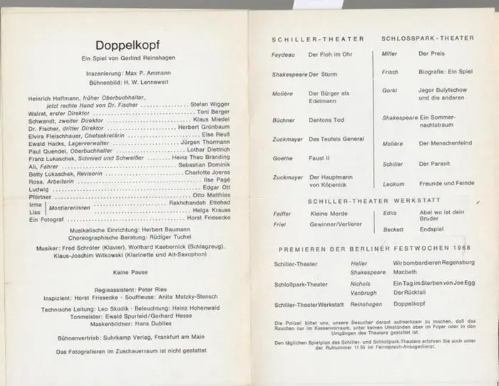 Schiller-Theater Werkstatt. Berlin. - Gerlind Reinshagen: Doppelkopf. Spielzeit 1968 / 1969.Heft 199. General-Intendant Boleslaw Barlog. Inszenierung Max P. Amman. Kostüm / Bühnenbild H.W.Lenneweit. Darsteller Stefan Wigger / Toni Berger / Klaus Mied