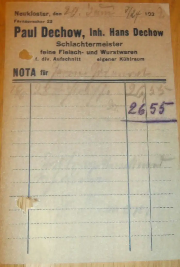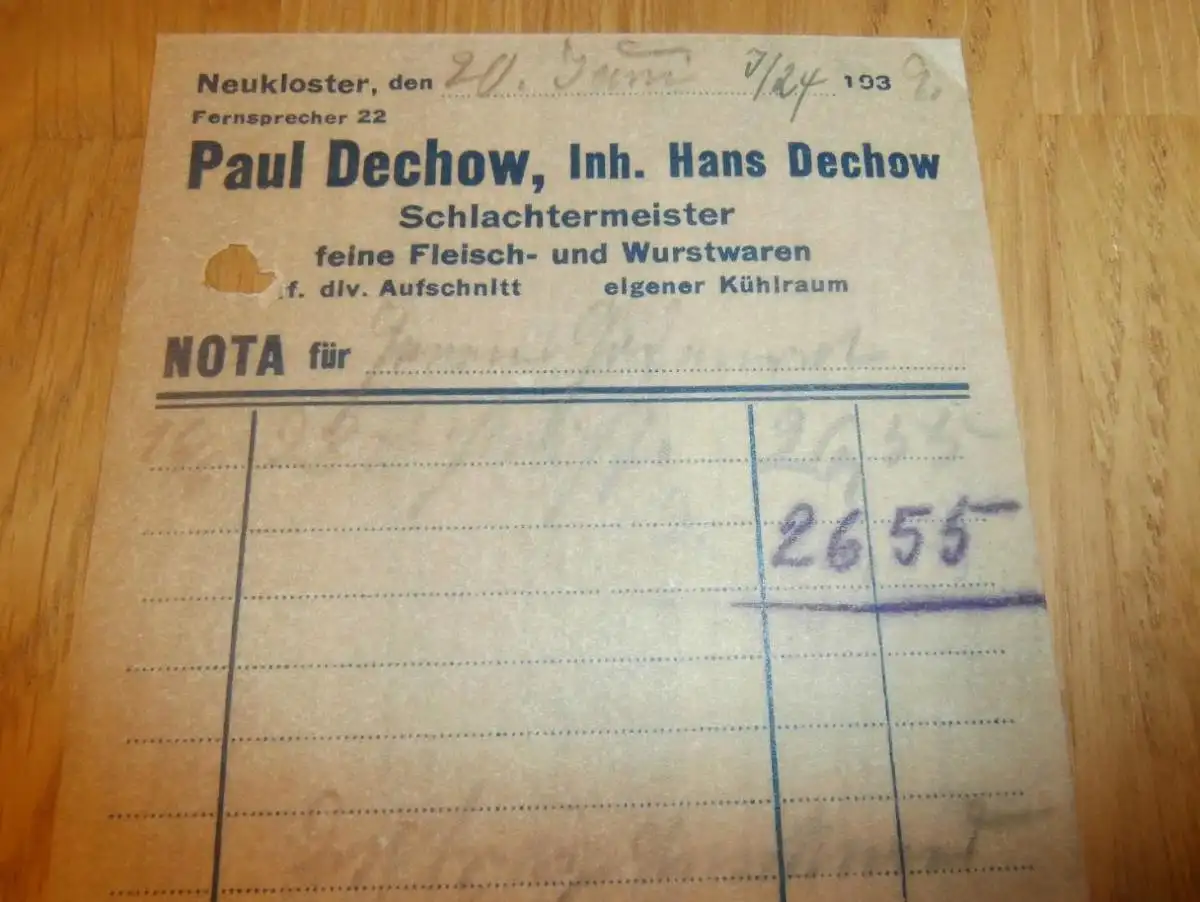 Schlachtermeister - Paul Dechow in Neukloster 1924 , Schlachter , alte Rechnung , Reklame , Werbung , Mecklenburg !!