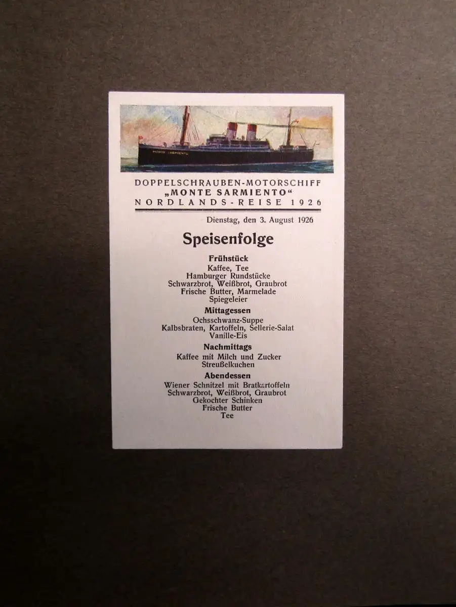 Auf Einband des 1. Album eine Banderole der Monte Sarmiento montiert, dies mittig gerissen. Papier sauber, Fotos in kräftigen Kontrasten wie von Profihand aufgenommen. Am Ende von Band 2 eine Speisekarte der Monte Sarmiento montiert. Sehr gutes Exemplar