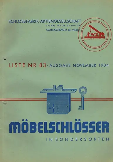Schlossfabrik-Aktiengesellschaft Schlagbaum vorm. Wilh. Schulte. Möbelschlösser in Sondersorten. Liste Nr. 83 Velbert (Rheinland), Schulte-Schlagbau, November 1934.