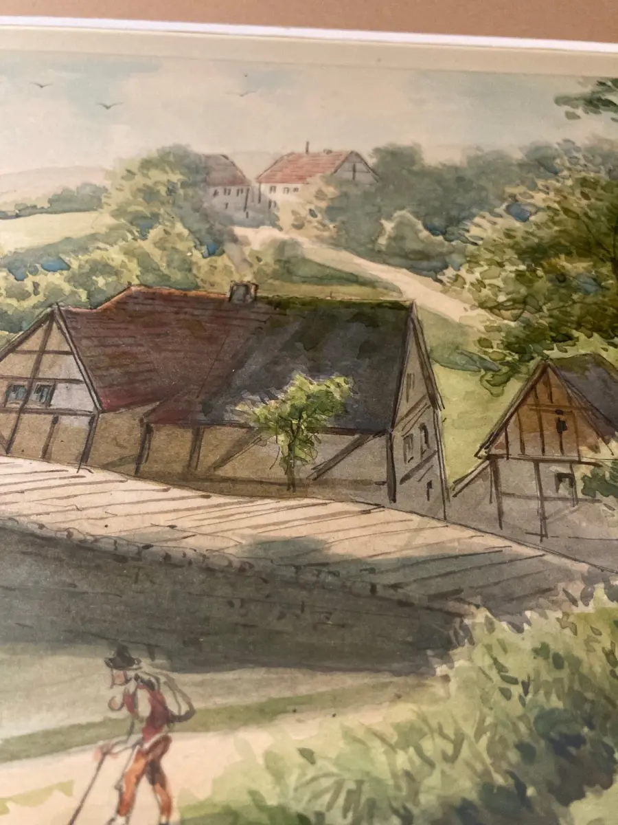 Passepartout außen sauber, Zeichnung in super Zustand, Pappe darunter stärker gebräunt