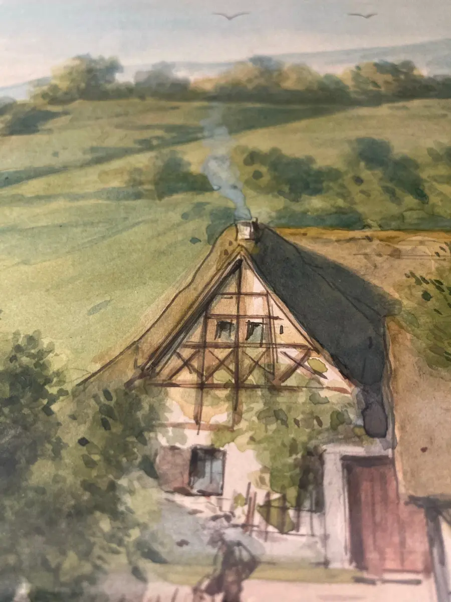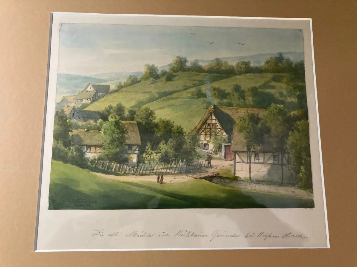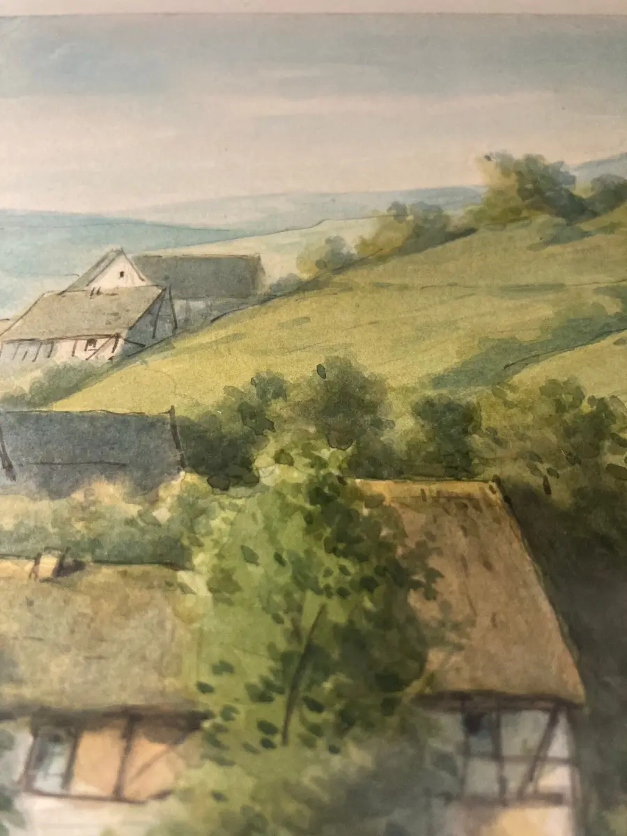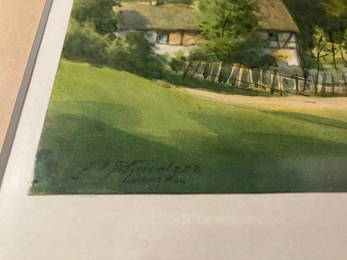 Passepartout außen sauber, Zeichnung in super Zustand, Pappe darunter stärker gebräunt