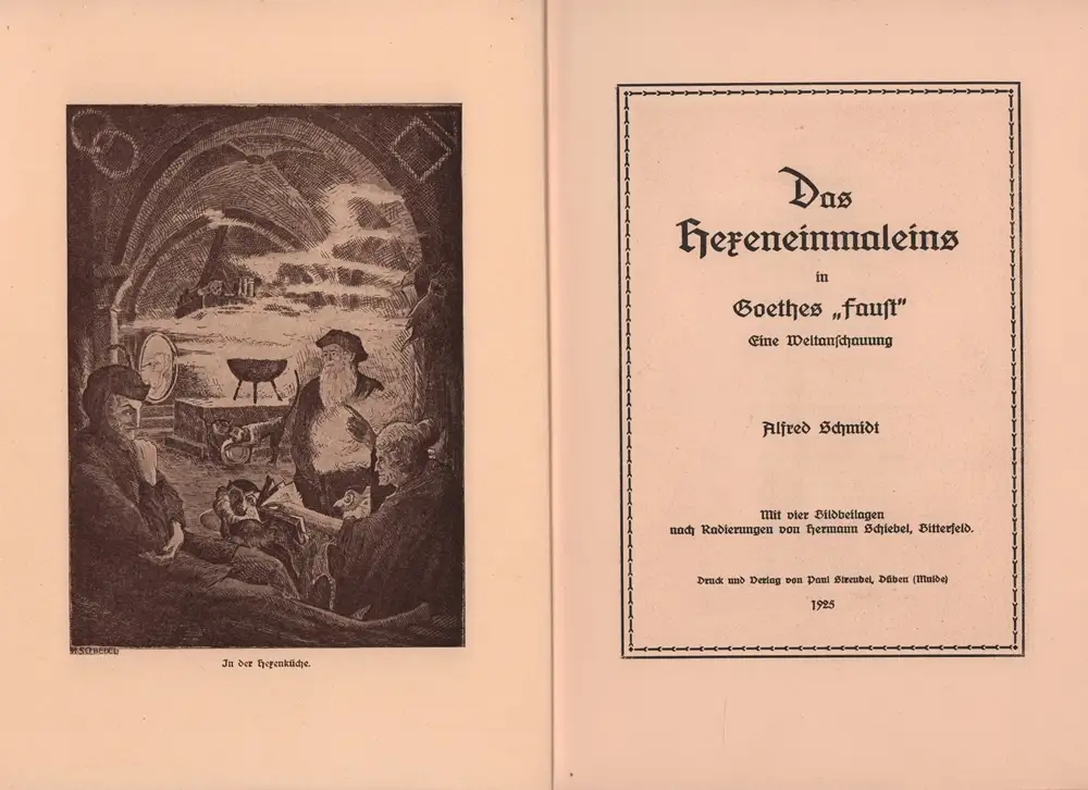 Über den Lehrer Alfred C. Richard Schmidt (1874 - ) aus Magdeburg, Pseud. C. Richard, ist wenig bekannt, siehe Franz Brümmer: Lexikon der deutschen Dichter u. Prosaisten vom Beginn des 19. Jahrhunderts bis zur Gegenwart. Bd. 6. 6. Aufl. Leipzig, 1913. - "Die vorliegende Arbeit beschäftigt sich mit der dunkelsten Stelle des 'Faust', dem Hexeneinmaleins. Sie nimmt dies zur Grundlage, um darauf eine Weltanschauung aufzubauen, deren Einzelheiten zum größen Teile mit Goethes eigenen Worten belegt werden. In ihr spielt die Mystik eine bedeutende Rolle. Möge die kleine Arbeit, die kein Faustkommentar sein will, dazu beitragen, dem Leser das herrlichste Werk der Weltliteratur näher zu bringen!" (Vorwort). - Zu dem Maler u. Graphiker Hermann Schiebel (1896-1973) siehe Vollmer 4, S. 184. - Unbeschnitten. - Gering bestoßen, kl. Hellfleck a. VDeckel; NaV, erste 3 Bll. mit minimalem Einriß im Fußsteg; sonst gutes, sauberes Exemplar