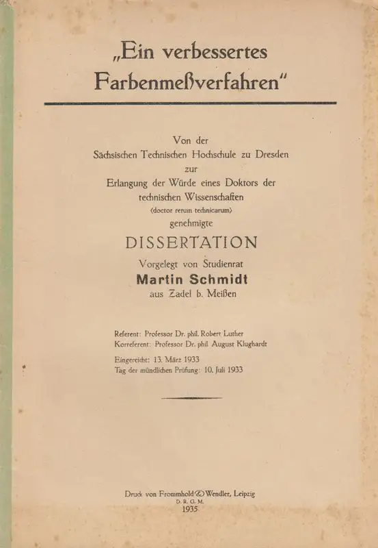 Schmidt, Martin: Ein verbessertes Farbenmeßverfahren. (Dissertation).