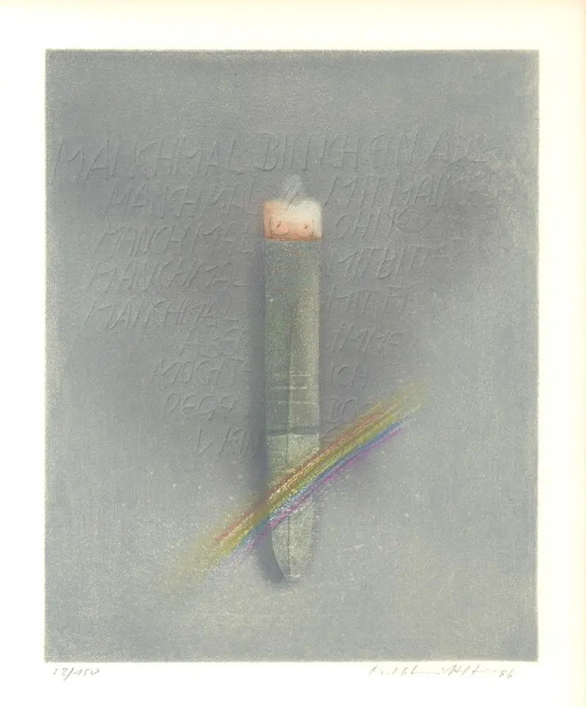 Münster, Edition Schnake, [1985, [4] Bl. Mit 1 S. Text, 1 ORIGINAL-FARBRADIERUNG mit Text im Prägedruck. Lose in vom Künstler eigenhändig illustr. u. signierter OPp.-Mappe mit aufgelegter, stilisierter Speerspitze aus Metall.