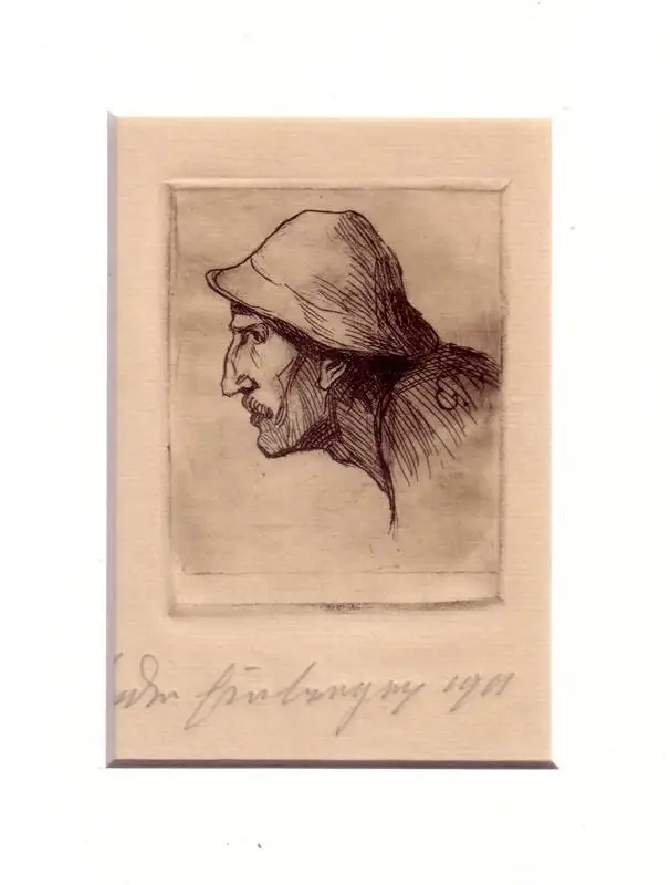 Lavierte Kaltnadel-Radierung, im Bild Initial "E", unterhalb der Darstellung mit Bleistift bezeichnet "Ludw. Heuberger 1911" Bildgröße 8 x 6,5 cm, Blattgr. 18 x 13 cm. Unter Passepartout