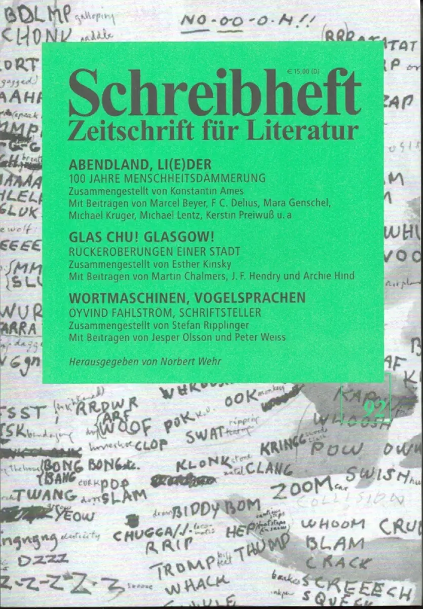 Leitthemen: Abendland, Li(e)der: 100 Jahre Menschheitsdämmerung // Glas chu! Glasgow!: Rückeroberungen einer Stadt // Wortmaschinen, Vogelsprachen: Öyvind Fahlström, Schriftsteller. Mit Beiträgen von Konstantin Ames, Johannes R. Becher, Marcel Beyer, Sonja vom Brocke, Crauss, Friedrich Christian Delius, Mara Genschel, Simone Kornappel / Tom Bresemann, Thorsten Krämer, Michael Krüger, Norbert Lange, Michael Lentz, Frank Milautzki, Kerstin Preiwuß und Ulf Stolterfoht über Gedichte von Johannes R. Becher, Gottfried Benn, Albert Ehrenstein, Iwan Goll, Georg Heym, Jakob van Hoddis, Else Lasker-Schüler, Karl Otten, Ludwig Rubiner, Ernst Stadler, August Stramm und Georg Trakl. - Gut und sauber, noch eingeschweißt
