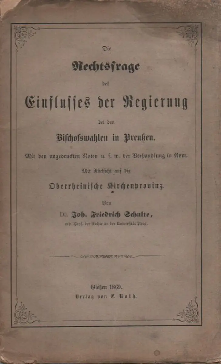 Schulte, Johann Friedrich von: Die Rechtsfrage des Einflusses der Regierung bei den Bischofswahlen in Preußen: mit den ungedruckten Noten u.s.w. der Verhandlung in Rom. Mit Rücksicht auf die Oberrheinische Kirchenprovinz.
