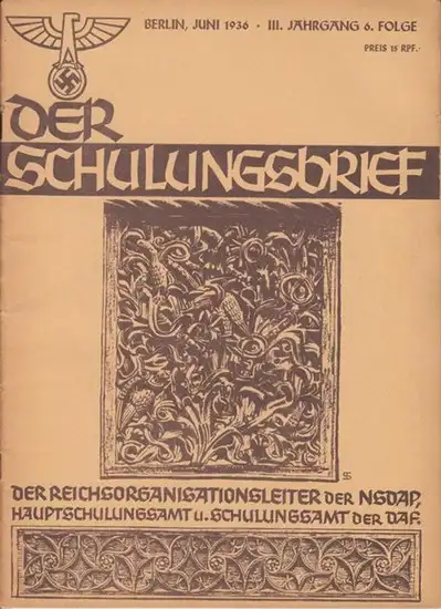 Titel: Der Schulungsbrief. 3. Jahrgang 6. Folge, Juni 1936. Das zentrale Monatsblatt der NSDAP. Aus dem Inhalt: Dr. R. Stampfuß - Gustav Kosinna: Der Bahnbrecher wahrer deutscher Vorgeschichte / F. H. Woweries - Von der Weltschande zum Frieden / Gerog Stammler - Mittsommerfeuer / Prof. Dr. P. Schulze-Naumburg - Deutsche Kunst im Mittelalter, I. Teil / u.a