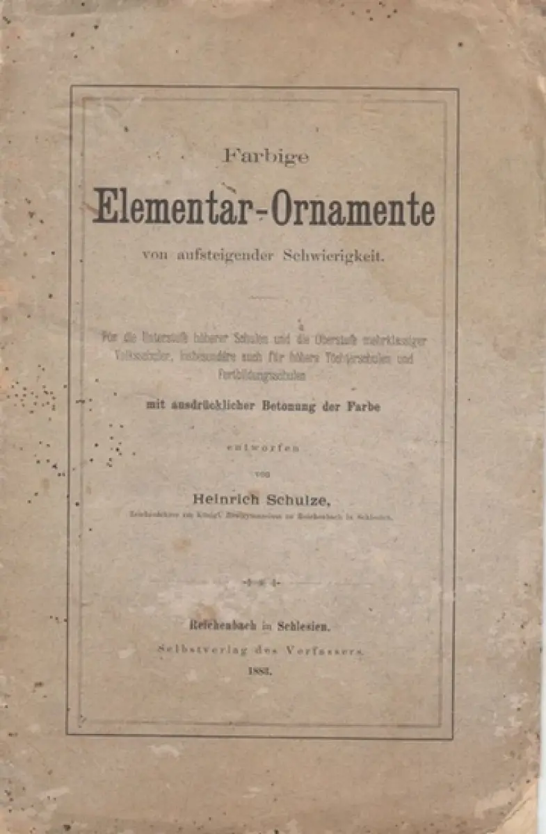 Schulze, Heinrich: Farbige Elementar-Ornamente von aufsteigender Schwierigkeit. Für die Unterstufe höherer Schulen und die Oberstufe mehrklassiger Volksschulen, insbesondere auch für höhere Töchterschulen und Fortbildungsschulen, mit ausdrücklicher Betonu
