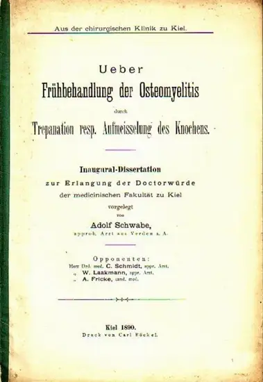 Schwabe, Adolf: Ueber Frühbehandlung der Osteomyelitis durch Trepanation resp. Aufmeisselung des Knochens. Dissertation an der Universität zu Kiel, 1890.