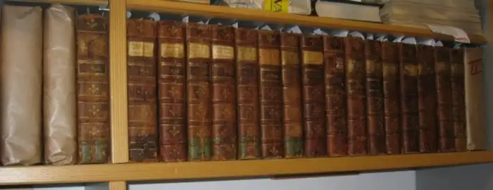 Freie Beschreibung: Gr.-8°. XXI uniforme Halblederbände der Zeit mit goldgeprägten Rückentiteln und Bandnummern auf Rückenschilden sowie etwas goldgeprägter Rückenverzierung. Ordentlich ausgeschiedenes Exemplar des Reichs-Postamts mit einem hübschem ExLibris im Innendeckel, einem entsprechenden Stempel auf dem Titel und teils mit Resten eines Etiketts am Buchrücken unten. Kapitale bestoßen und mit kleinen Einrissen, Ecken teils durchstoßen und etwas gebogen, Dreiseitenrotschnitt. Das Leder mit kleinen Defekten. Die Buchblöcke ganz überwiegend schön fest. Bei uns eingebunden 659 (statt 655!) Kupfertafeln, Karten und Pläne incl. dem gestochenen Wappen Friedrichs III, obwohl 6 Tafeln FEHLEN. Wenige Karten mit kleinen Einrissen und etwas angeschmutzt. Im Innenbereich überwiegend sauber. Durchaus gutes Exemplar, mit den ergänzten Kopien auch komplett