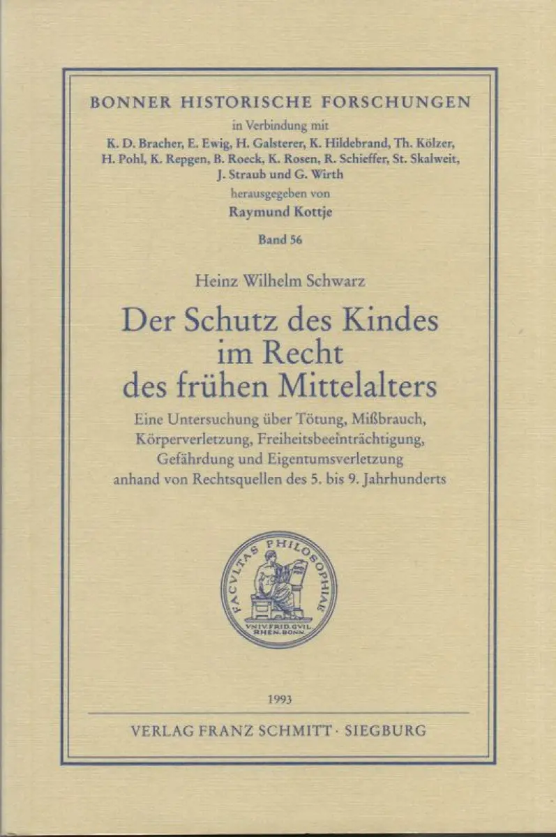 Schwarz, Heinz Wilhelm: Der Schutz des Kindes im Recht des frühen Mittelalters: eine Untersuchung über Tötung, Mißbrauch, Körperverletzung, Freiheitsbeeinträchtigung, Gefährdung und Eigentumsverletzung anhand von Rechtsquellen des 5. bis 9. Jahrhunderts.