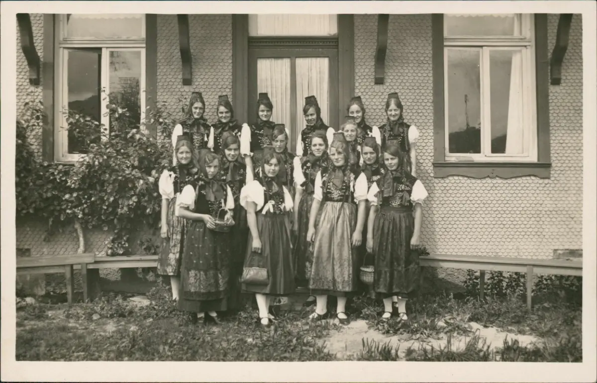Name: Schwarzwald Trachten Typen unge Frauen vor Haus