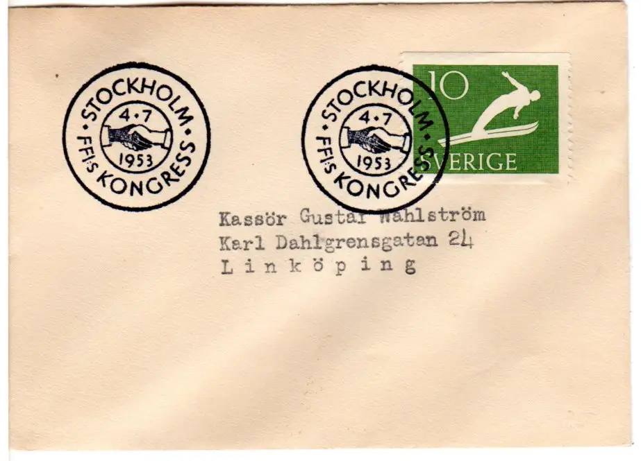 Schweden 1953, Brief m. 10 öre u. Sonderstpl. Stockholm FFI:s Kongress m. Abb.