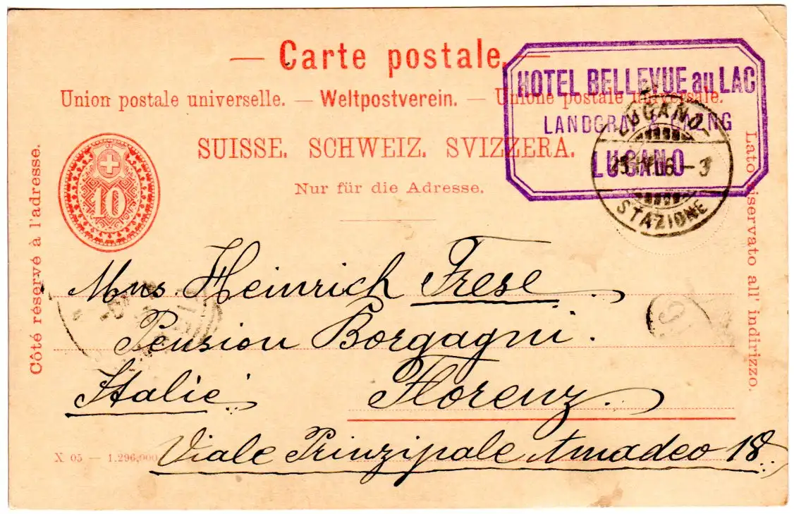 Schweiz 1906, 10 C. Ganzsache v. Lugano n. Italien m. Bellevue au Lac Hotelstpl.