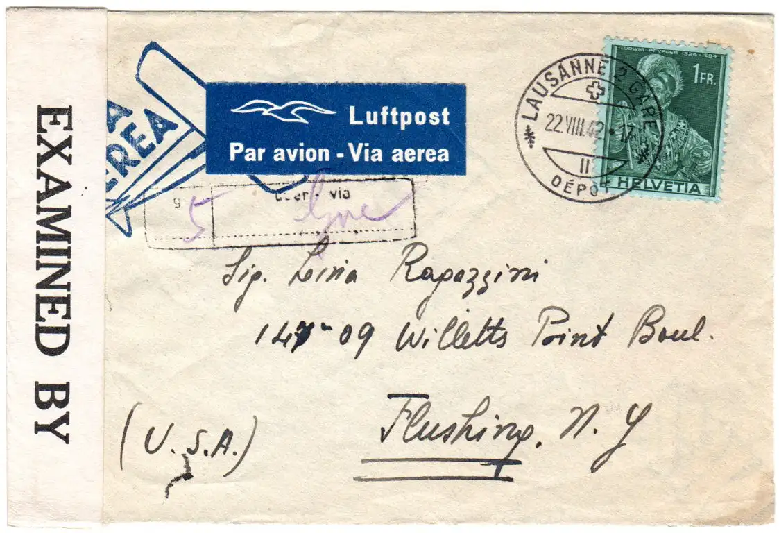 Schweiz 1942, EF 1 Fr. auf Luftpost Zensur Brief v. Lausanne via Genf n. USA