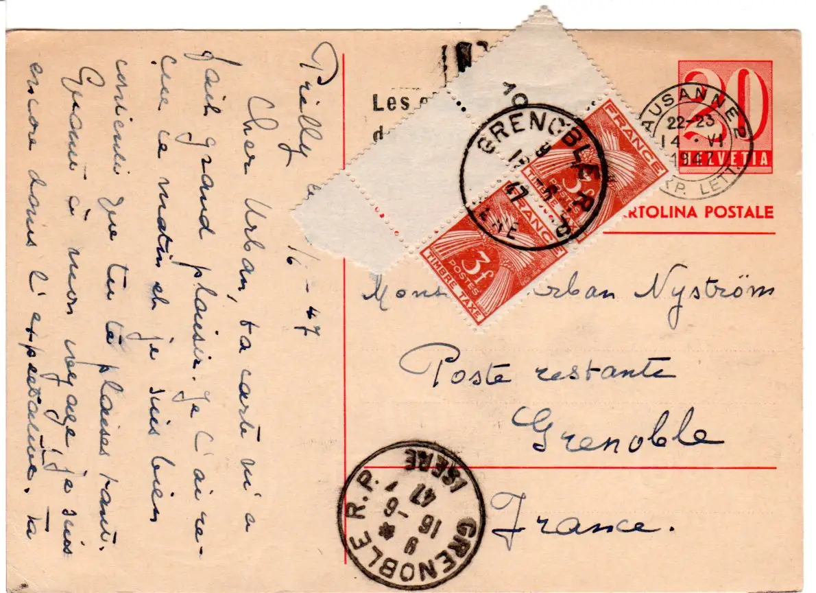 Schweiz 1947, 20 C. Ganzsache v. Lausanne m. Paar 3 F. Frankreich Portomarken