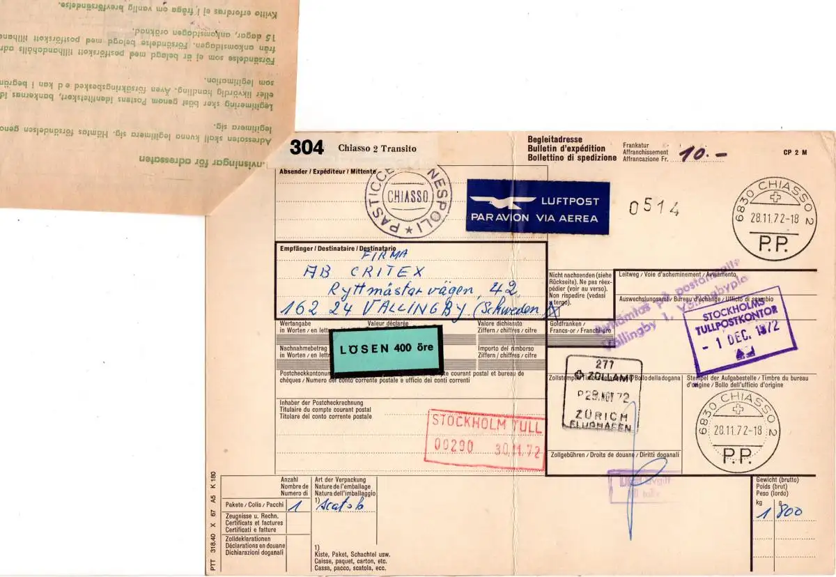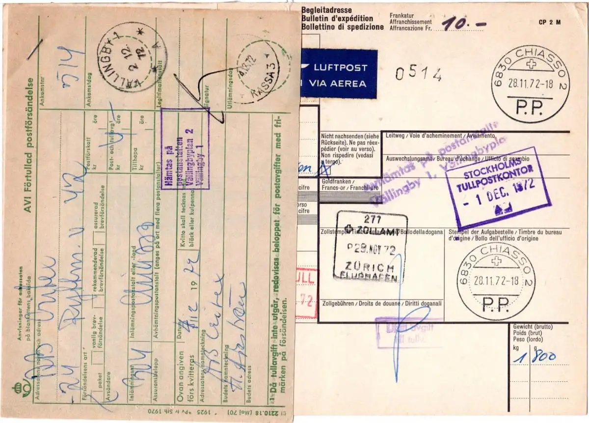 Schweiz 1972, CHIASSO 2 P.P. auf Luftpost Paketkarte m. Schweden Porto-Etikett