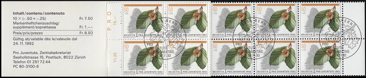 Suisse Carnet de marque 0-93, Par Juventute bois bois hêtre rouge 1992, Esst Chêne