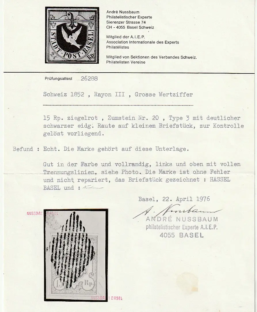 Schweiz: Nr. 10 (Zumstein 20) auf Luxus-Briefstück, Attest
