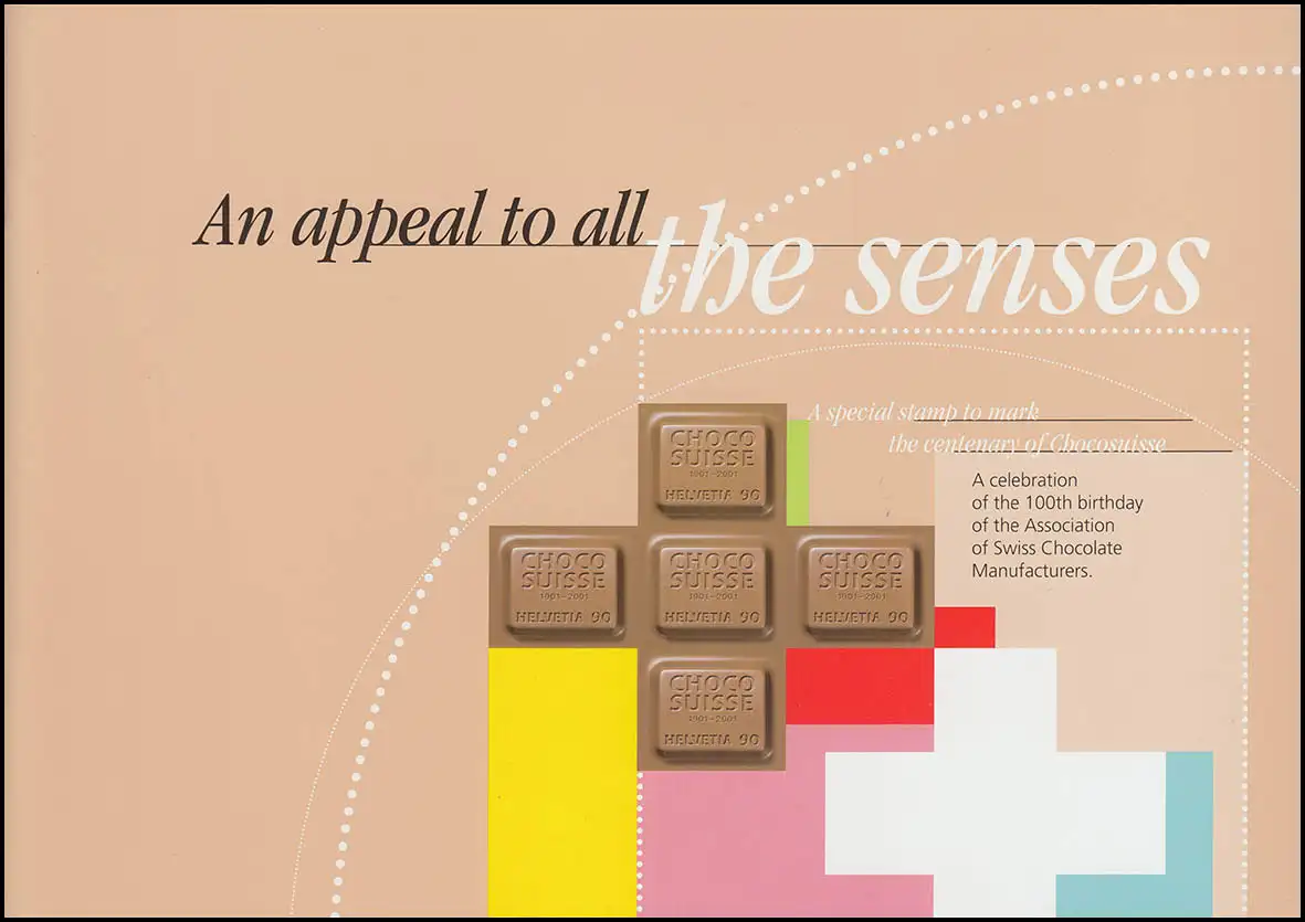 Suisse Édition PTT Chocolats Industriels 2001, texte anglais, petit arc **