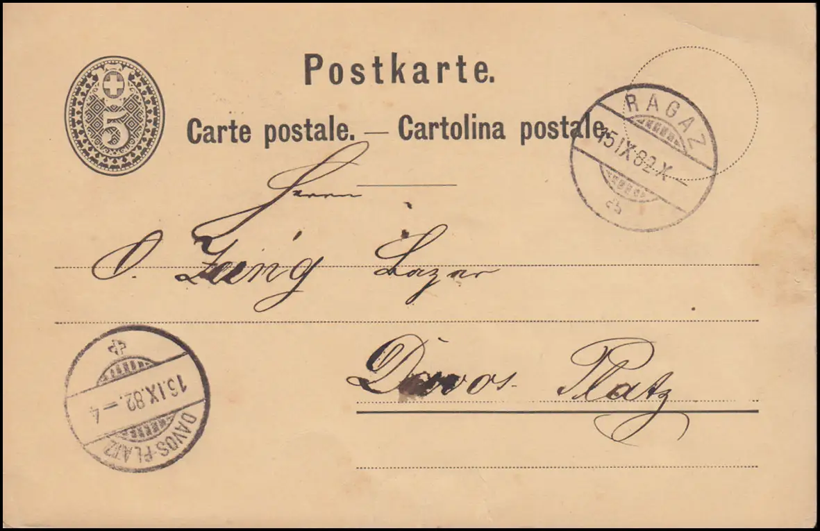 Suisse Carte postale P 12 chiffre dans l'ovale de RAGAZ 15.9.1882 après DAVOS PLATZ 16.9.