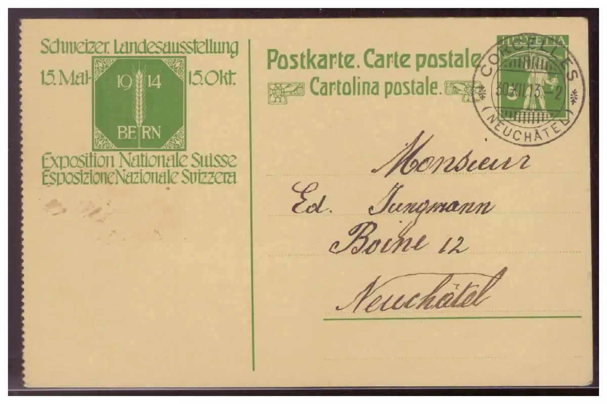 Schweiz (008036) Ganzsache schweizer Landesausstellung gelaufen Corcelles am 30.12.1913