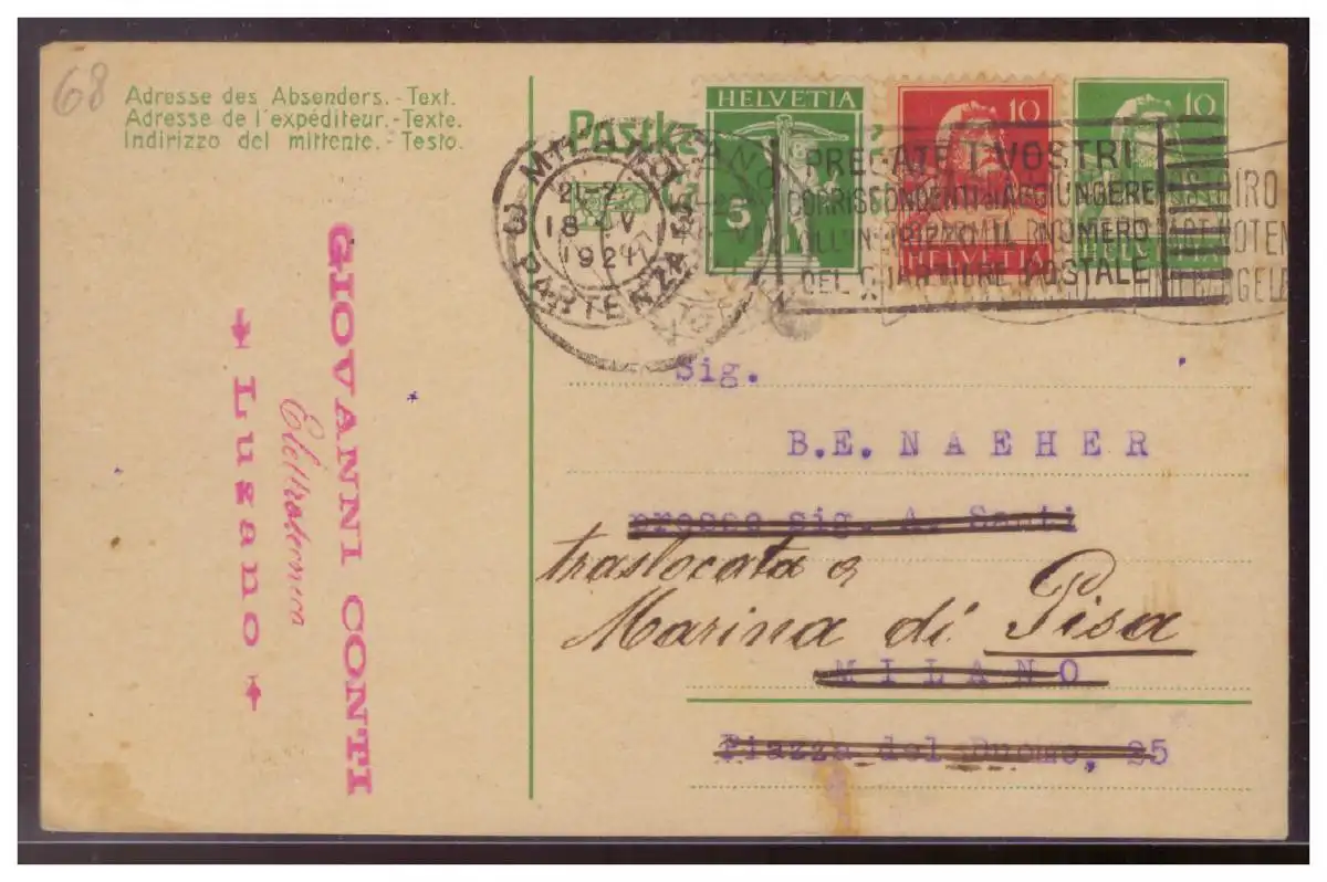 Schweiz (008037) Ganzsache mit Zusatzfrankatur gelaufen nach Milano Weiterleitung nach Pisa 1924
