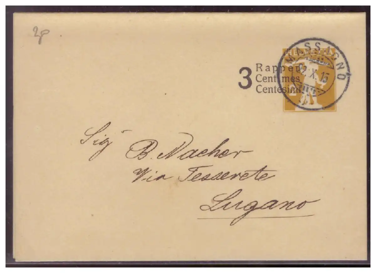 Schweiz (008044) Ganzsache Umschlag gelaufen nachMassagno nach Lugano am 22.10.1915